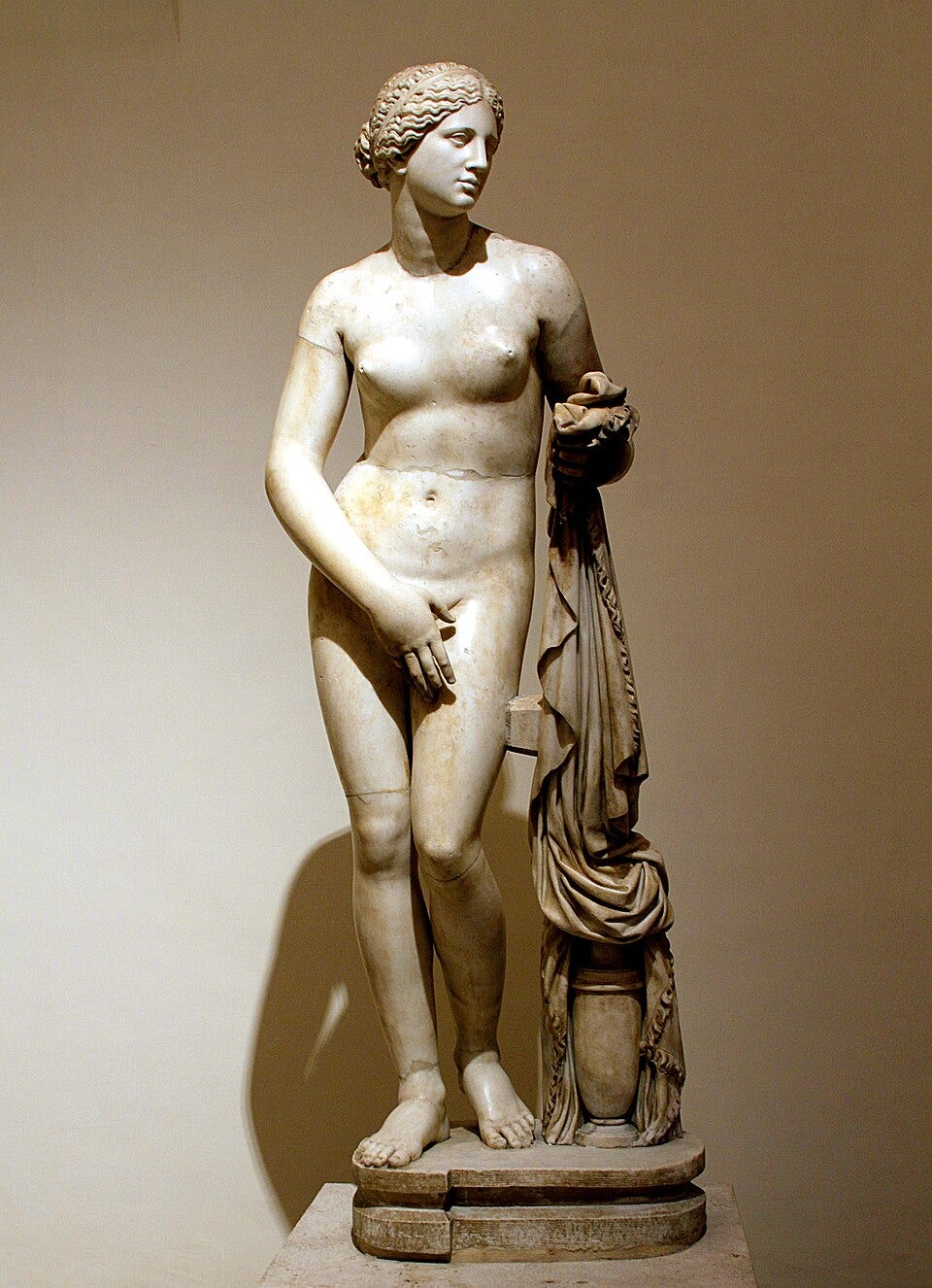 👉🏻 ¿Qué estamos viendo? Vemos a Afrodita, la diosa del amor y la belleza. Está en un momento íntimo, justo antes o después de tomar un baño. Con una mano sostiene su túnica sobre una vasija y con la otra cubre tímidamente su pubis.